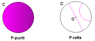 I punti del nostro modello (che chiameremo P-punti) saranno i punti del piano che giacciono all'interno di C, non terremo in considerazione i punti che giacciono sulla circonferenza C. Una P-retta sarà l'insieme di tutti i P-punti che giacciono su una circonferenza ortogonale a C o quelli che giacciono su una retta passante per O. Precisiamo che quando parliamo di punti, rette, cerchi, ci riferiamo alle nozioni euclidee, quando invece aggiungiamo a queste parole il prefisso P allora ci stiamo riferendo al concetto corrispondente del modello che stiamo costruendo.