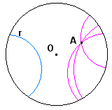 L'assioma delle parallele non vale all'interno del modello di Poicaré: dati una P-retta, r, e un P-punto, A, esistono più P-rette passanti per quel punto che non incontrano la P-retta r. |